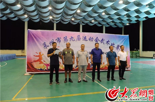 大众网莱州8月27日讯 (通讯员 张敬明 记者 孙国栋) 8月25日上午,莱州市第九届运动会武术比赛在莱州市汇泉学校演武堂举行,来自各镇街、市直机关、社团和企业的15个代表队、60多名运动员展开比赛对决。莱州市体育发展中心主任胡智鹏、副主任张伟山、莱州市武术协会副会长兼秘书长徐兴周、副秘书长李帅等出席开幕式,莱州市武术协会副主任张伟山致开幕词。