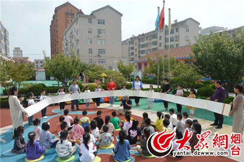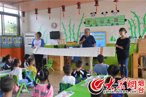 大众网莱州9月29日讯 国旗下,65岁的农民书法家于文京盘腿而坐,一边展示他书写的道德主题书法长卷,一边向莱州蓝天幼儿园的师生“讲德”,正式启动他的向万名青少年讲述爱国、尊师、守规等内容的崇德尚贤之行,作为献给共和国69周年的礼物。