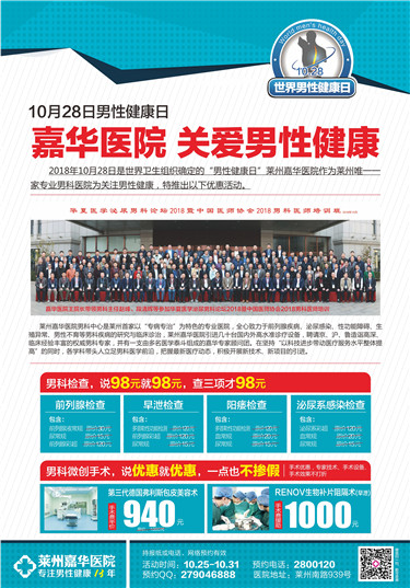 大众网莱州10月24日讯 世界卫生组织将每年的10月28日确定为“世界男性健康日”,2018年是第十九个男性健康日,宣传活动主题是“关注男性健康,助力健康中国福”。为提高莱州市民对男性健康的关注,帮助饱受男科疾病困扰的男性找回健康。近日,莱州嘉华医院强势推出“男性健康工程”系列优惠活动。