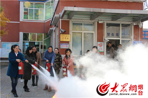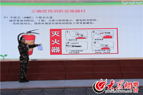 学校还组织开展消防演练。消防警报声一响起,全体教师立即到位,指挥学生用毛巾捂住口鼻,按既定的逃生路线,有秩序地从教学楼撤离到操场的指定位置。随后,来自莱州市消防大队的校外辅导员为学生带来一堂生动的消防知识教育课,现场讲解了消防安全常识和火灾逃生自救知识,并为教职工进行灭火器培训,使教职工熟练掌握灭火技能技巧。