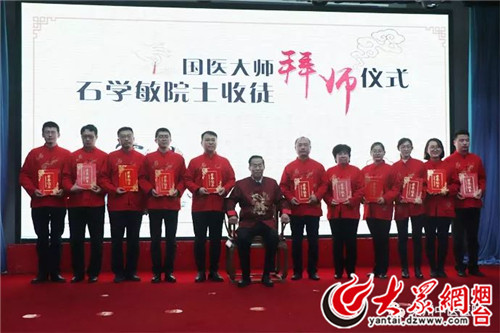 讲座结束后,进行了“国医大师石学敏院士拜师收徒仪式”,石学敏院士共收莱州市中医医院11名传承人为徒。拜师仪式现场,由传承人代表郭瑞堂领读并呈上“拜师帖”、行敬茶礼,随后传承人代表郭瑞堂向石学敏院士敬献礼物,石学敏院士授予徒弟们荣誉证书,整个拜师过程庄严而神圣。传承人将在师父的教导下,遵循师训、发扬国粹,造福于莱州市民。