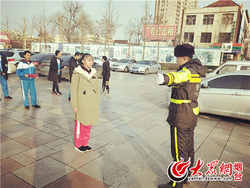 大众网莱州·海报新闻12月20日讯 (通讯员 王晓艳 记者 田丰恺) “同学们,今天我们来学习几个常用的交警指挥手势,首先将左胳膊抬起与身体垂直90度,然后右手带动右臂快速并有力的向左侧挥动,这个动作是直行手势......”16日上午,莱州剧院广场来了一群身穿着校服的小志愿者,他们是双语学校的学生,利用周末的时间来跟交警叔叔学习交通指挥和交通安全知识。