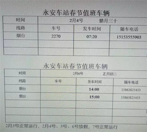 永安车站短途放三天假(2月4,5,6)号。三天假期间长途只安排表中所列班次。