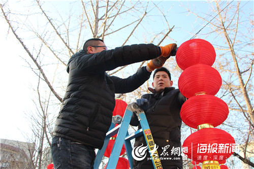 莱州市住建局路灯管护中心工作人员正在悬挂灯笼