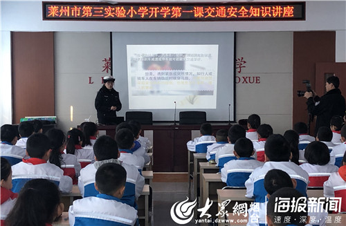 大众网莱州·海报新闻2月25日讯 (通讯员 谭娟 记者 田丰恺) 新学期伊始,为进一步提高师生的交通安全意识和自我保护防范能力,确保师生交通安全,2月25日上午莱州市第三实验小学邀请市公安局交警大队民警,为四年级全体师生进行了“开学第一课”交通安全知识讲座,切实提高了在校师生的交通安全意识、法制意识和文明意识。