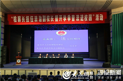大众网莱州·海报新闻2月26日讯 (记者 田丰恺 通讯员 任文娟) 26日,莱州市双语学校开展“检察长担任法治副校长暨开学季普法进校园”活动,莱州市人民检察院、共青团莱州市委、市教体局、市关工委、双语学校有关领导出席活动。