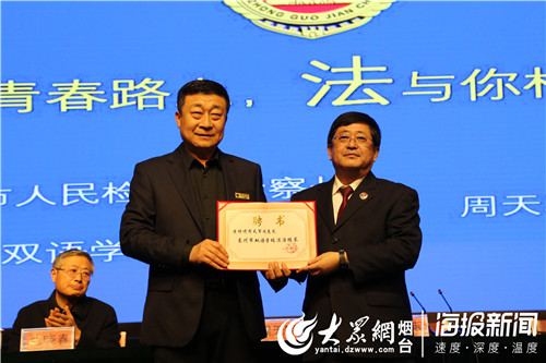 莱州双语学校副校长鲍海起向市人民检察院检察长周天军颁发了法治副校长聘书