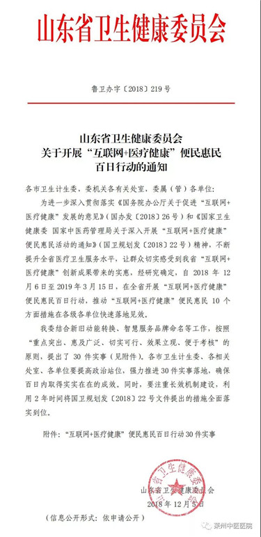 自2018年12月《山东省卫健委关于开展“互联网+医疗健康”便民惠民百日行动的通知》(鲁卫办字[2018]219号)文件下发以来,莱州市中医医院积极响应号召,推动行动落到实处,让群众切实感受到 “互联网+医疗健康”创新成果带来的实惠。 [详细]