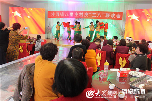 演出现场,15个精彩的节目,脍炙人口、通俗易懂的艺术表现形式,吸引了周边众多群众前来观看。一曲热热闹闹的灯笼舞《吉祥中国年》拉开了演出序幕,歌舞、戏曲、旗袍秀等内容丰富、形式多样、题材新颖的各种节目将演出推向高潮,博得了观众一阵阵掌声,现场气氛热烈。“为了庆祝“三八”妇女节,我们精心准备,坚持排练,发挥每一个人的特长,希望向大家展现一下我们新时代妇女健康文明、积极向上的精神风貌,也希望把快乐带给周围所有的姐妹。”八里庄村的妇联主席刘永萍说。
