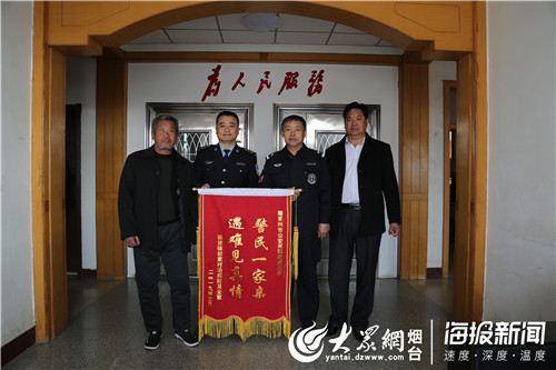 大众网莱州·海报新闻3月26日讯 (记者 田丰恺 通讯员 杨琳) 23日12时许,经过8小时连续奋战,奔波25公里,莱州市公安局驿道派出所民警成功将初家村村民汤振财家被盗的三头耕牛追回。26日上午,汤振财一家为驿道派出所送来印有“警民一家亲,遇难见真情”的锦旗,向办案民警表示感谢。