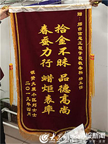 大众网莱州·海报新闻4月10日讯 (通讯员 王青 记者 孙国栋) 4月9日,莱州刘女士将一面印有“拾金不昧、品德高尚、春蚕力行、蜡炬表率”的锦旗递到烟台信息工程学校老师杨桂堂手中,对杨桂堂拾金不昧的高尚品德表示由衷的感谢。
