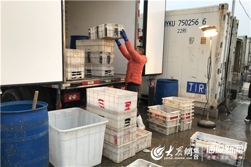 成箱的海鲜正在卸车,每个转运箱重量都在百斤左右