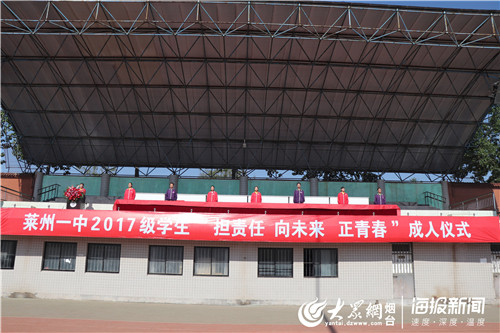 大众网莱州·海报新闻5月1日讯 (记者 曹昱 徐雨梅 通讯员 孙巍) 为让学生们肩挑公民的责任,担负时代使命,满怀信心地创造美好未来,5月1日上午,莱州一中在新校区西操场举行2017级学生“担责任 向未来 正青春”成人仪式。