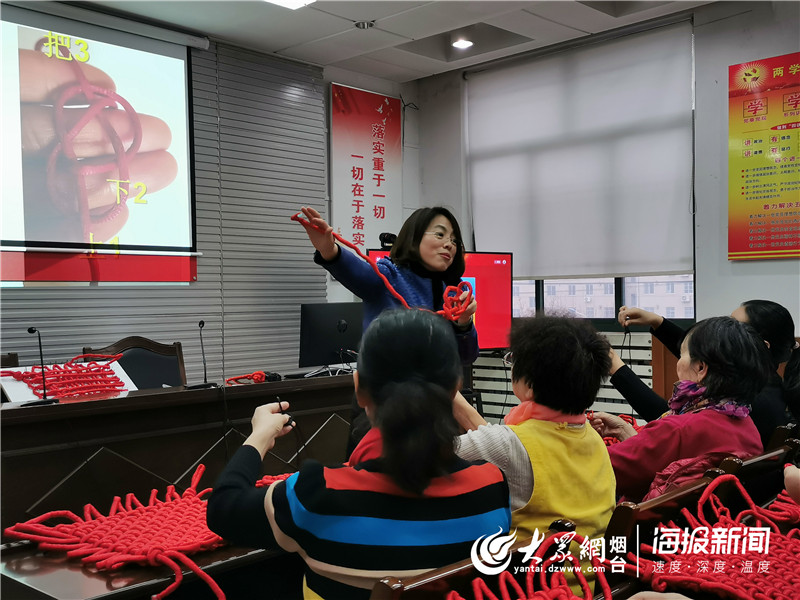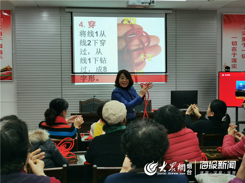 大众网·海报新闻烟台12月23日讯 (记者 田丰恺 通讯员 安秀峰) 为丰富辖区居民文化生活,加深对传统优秀文化绳结艺术的理解,营造浓厚节日气氛,文昌路街道云峰社区组织开展“迎元旦——编中国结 筑中国梦”活动。