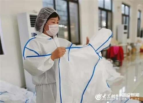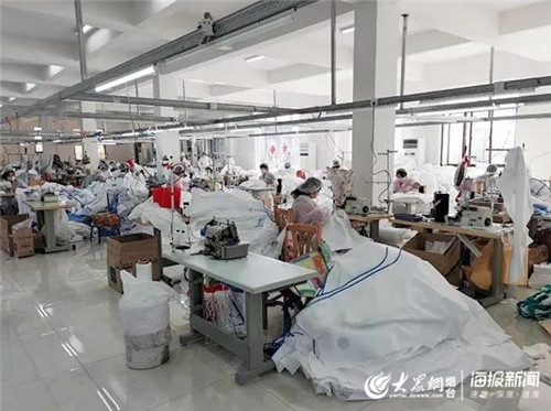 聂培青是这家企业的负责人,年三十晚上看春晚,看到武汉的情况觉得特别揪心,当下就坐不住了,她说:“因为咱是做防护服的,我就想马上开工,我们多做一件,就给武汉的医护人员多提供一件保护的外套”。从三十晚上到初一早上,聂培青打了近100通电话,电话里拜年的内容都变成了让大伙回来加班的请求,让聂培青没想到的是,疫情当前,她的100余名职工毫不犹豫地决定立刻复工。同时,她还主动找到虎头崖镇工会寻求帮助,镇政府的工作人员第一时间为企业复工开辟了绿色通道。