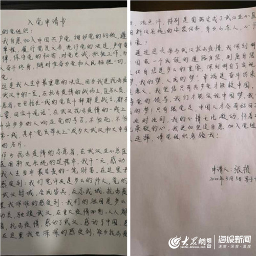 大众网·海报新闻烟台3月11日讯 (通讯员 记者 孙国栋) 3月5日,莱州市城港路街道朱由四村张桢从武汉亚心总医院向街道党建办公室发来一份来自“千里之外”的入党申请书。