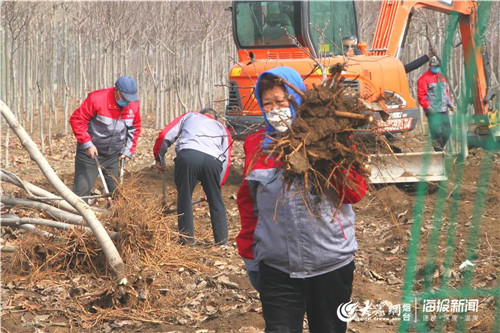 大众网·海报新闻烟台3月13日讯 (通讯员 于双燕 记者 孙国栋) 春回大地,芳草吐绿。3月10日,在位于虎头崖镇的百士通玫瑰庄园,满满一大车直径10公分左右、近2米高的玉兰树,一车车被运往沟邓村。庄园地里,一辆铲车正挥舞着铲臂将一棵棵玉兰树苗连根铲起,山东百士通生物科技股份有限公司总经理邓宗伦和工人们正在热火朝天地搬运苗木。